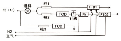 樣品氣通過一路載氣進(jìn)入FID1檢測器檢測出烴類氣體,通過另一路載氣先進(jìn)入TCD檢測器檢測H2、O2;然后經(jīng)鎳轉(zhuǎn)化爐,進(jìn)入FID2檢測器檢測出CO、CO2,克服大量CO、CO2對烴類氣體,尤其是對C2H2的檢測干擾,大大提高了烴類氣體的檢測靈敏度;